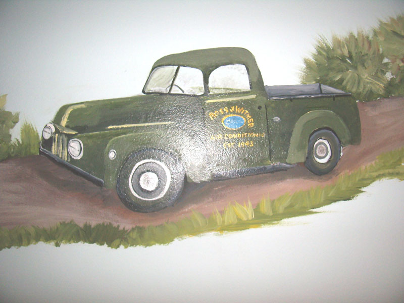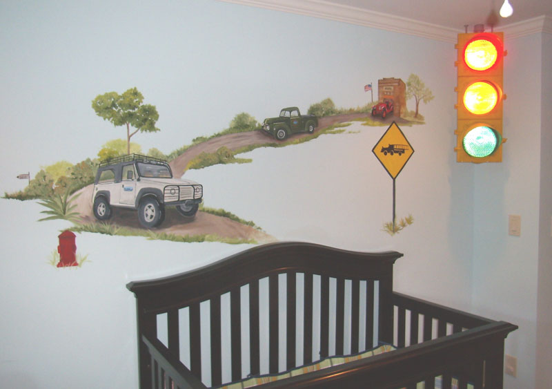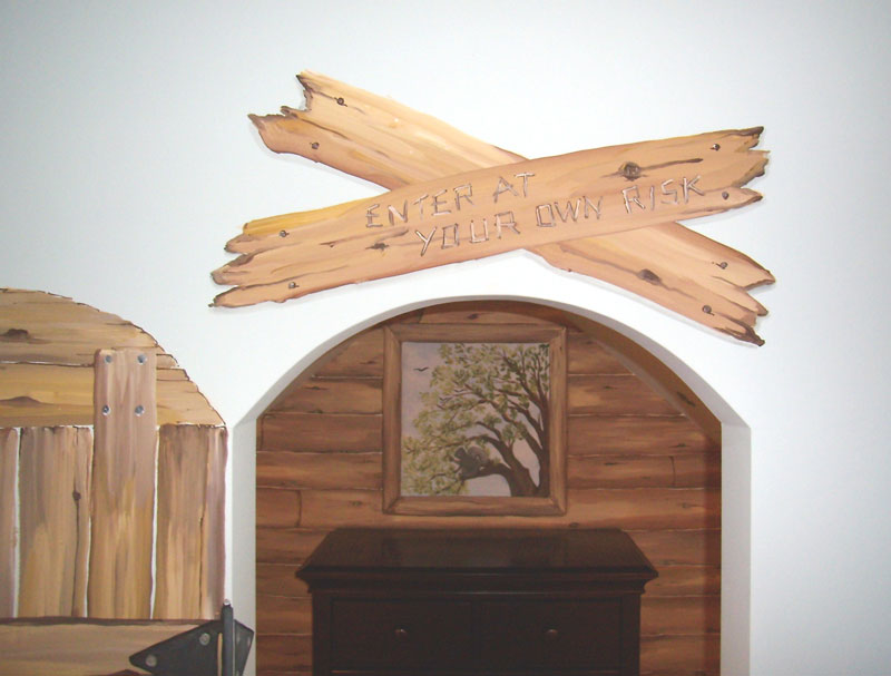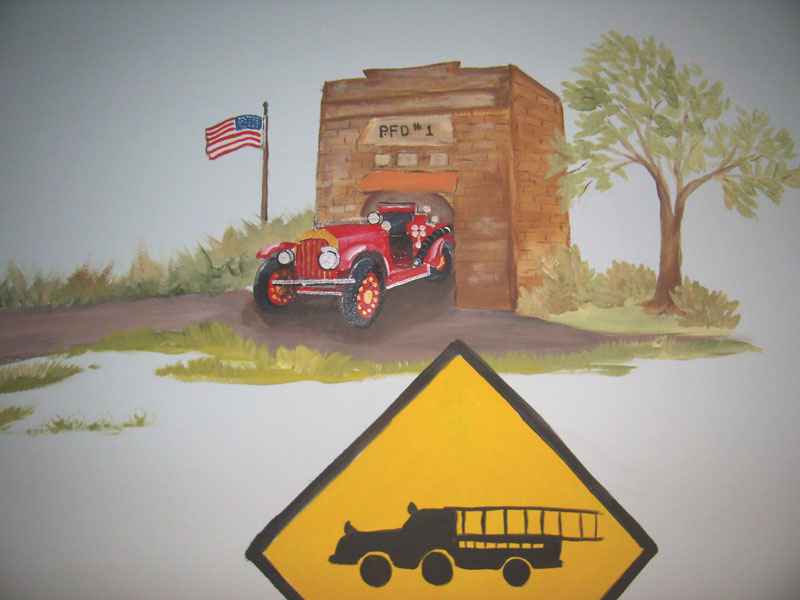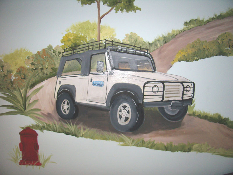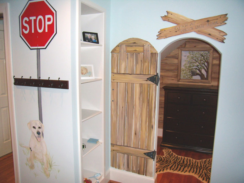 This little boy loves to go into his "log playhouse". The "faux" door, guarded by the pet dog "Boss" leads to the playhouse wall of "faux" logs and window to the outside. On the wall across the room he can see his father's "Defender", his grandfather's classic truck and an old fire engine like the toy downstairs.