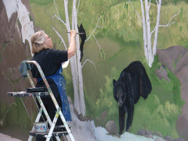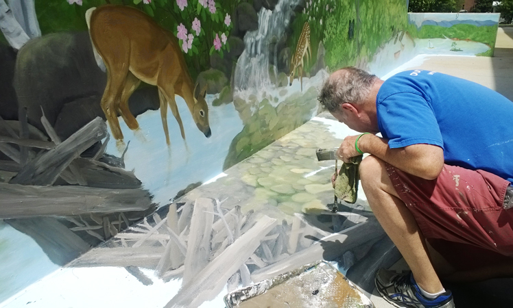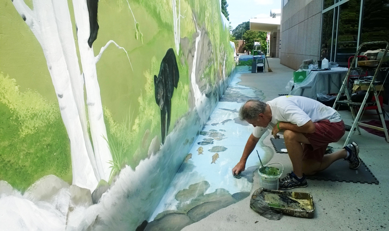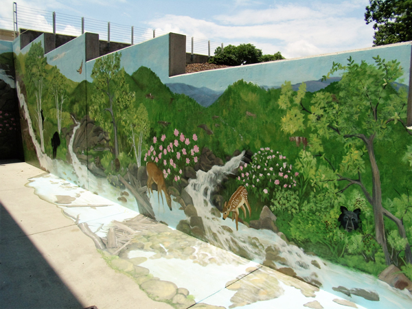 This large outdoor landscape mural is 70 feet in length, with one end starting at 17 feet high and stepping down to 3 feet. One unique aspect is the continuation of the mural on to the floor, which gives a sense of depth.