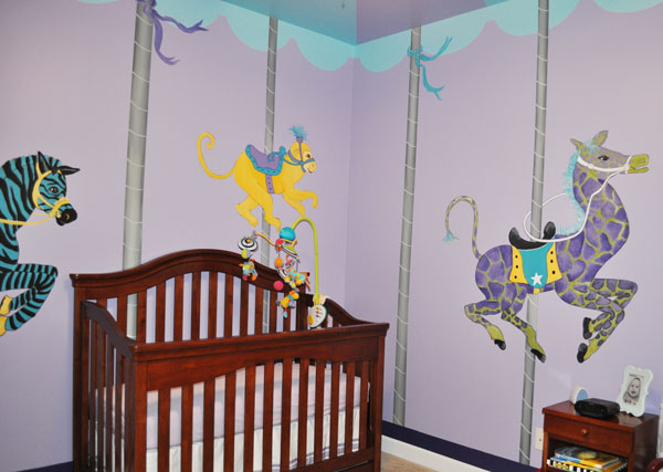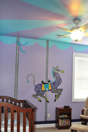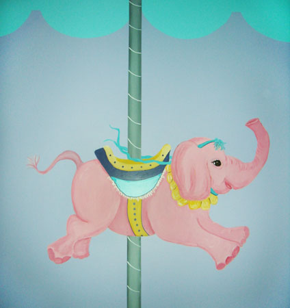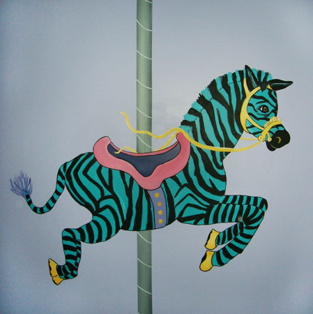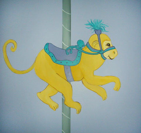 You step unto the carousel when you enter the room with four colorful, lifesize figures. The ceiling simulates the carousel top with ribbons and striped poles coming down the wall.