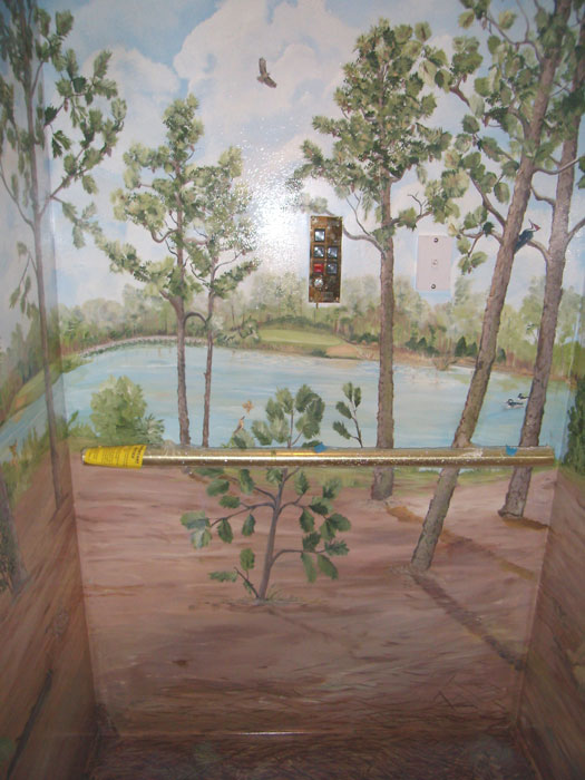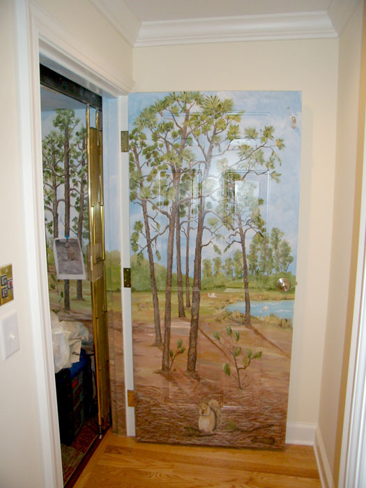 Upon entering this home elevator in this Pinehurst, NC, you are welcomed with a panorama landscape of the home's property, which is nestled among the pine trees and borders a lake and golf course.