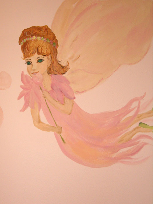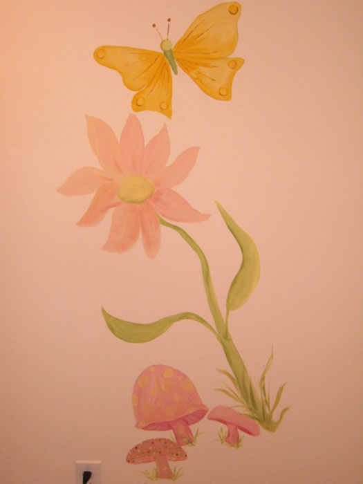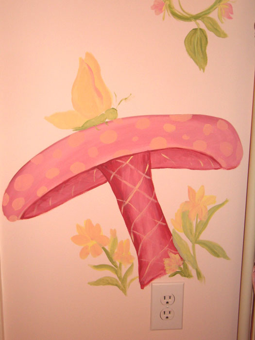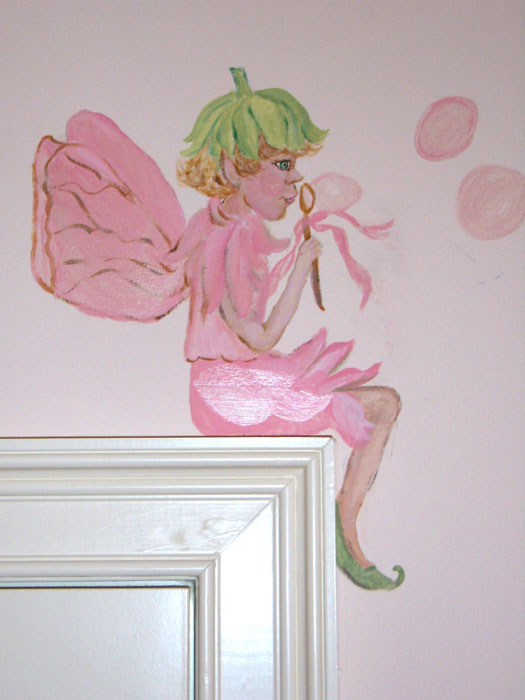 Fairies blow bubbles which float around the room adorned with vines, flowers, toadstools, and butterflies - all in colors which compliment the bedding and curtains in the room.