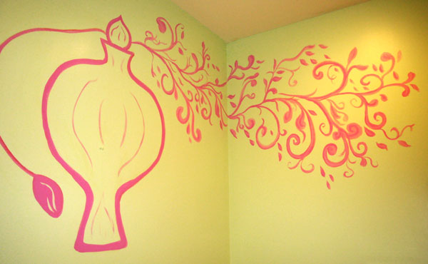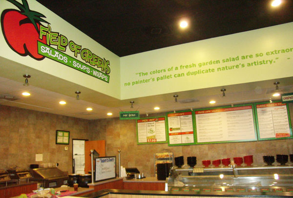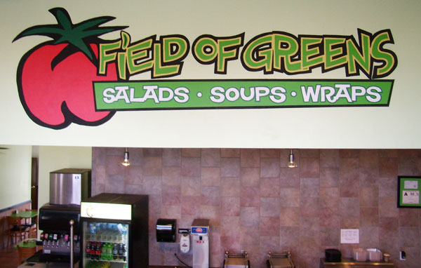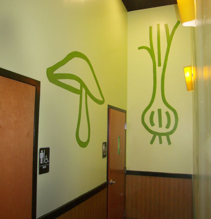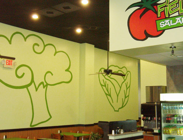 Commission for painting of logo above the serving area of restaurant plus outlines of large vegetables throughout area. Pink outlines appear in the ladies restroom.