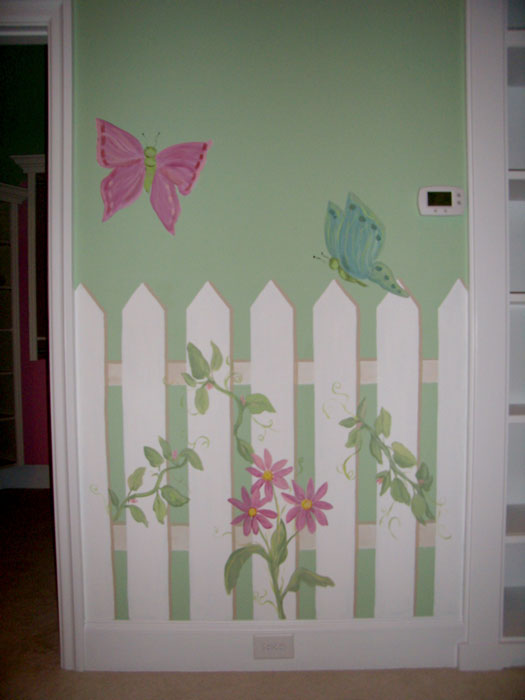 This young girl's room is highlighted by a Mural canopy above the bed and large butterflies around the wall. The other walls contain a "picket fence" with more butterflies and flowers.