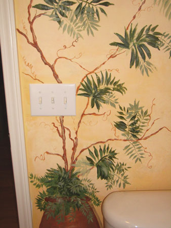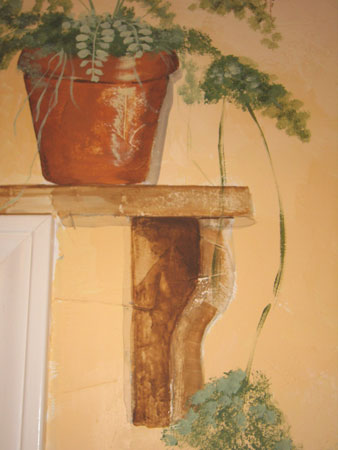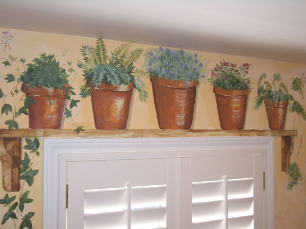 A collection of flower pots painted on a faux shelf above a window. Additional greenery on a nearby wall completes the scene.
