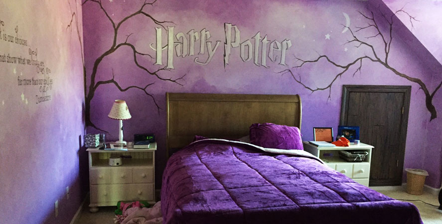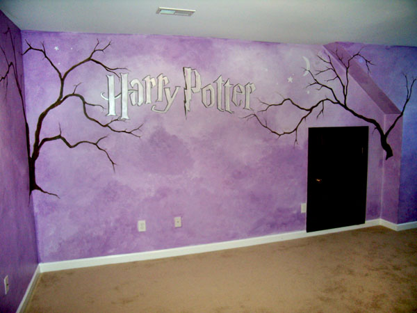 Sponged technique on all four walls to create the stormy, mystical aura plus tress and lettering for a young child's room.