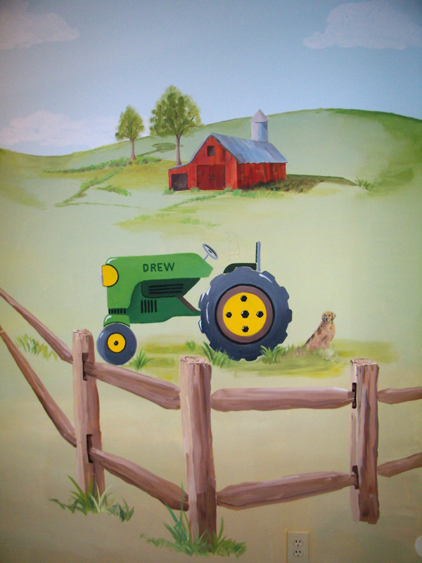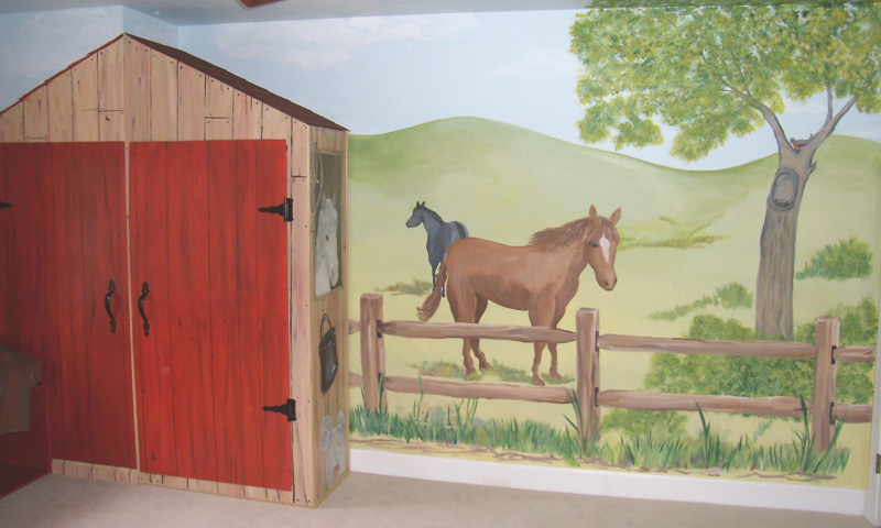 "Where oh where has my little dog gone? There he is next to the tractor, or is he in the barn?" This room for a 3 year old boy expresses his love of animals and has been transformed into his farm with a real "barn" as a closet and a window seat for storage and a place to curl up with a book or take a nap and dream of horses. CK paints designed and built the closet and window seat, coordinated the curtains and seat cushions and painted all the murals.