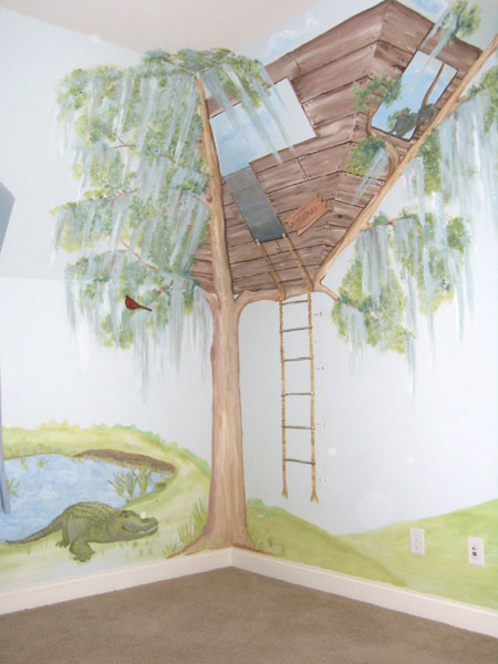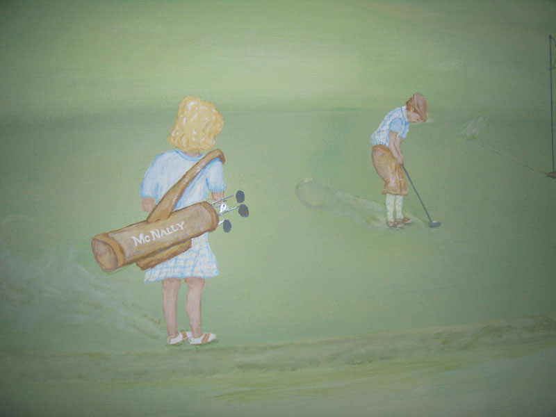 The theme for this room for a 3 year old boy is golf. The family lives on a golf course and he has his own set of clubs. We incorporated the clubhouse into the mural and have him playing with his older sister. A friendly aligator and turtle hang around the lake. The unusual slope of the walls lent itself to a treehouse and we incorporated a growth chart into the rope ladder.