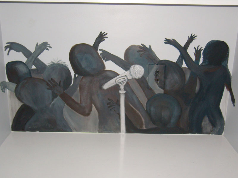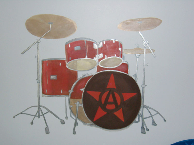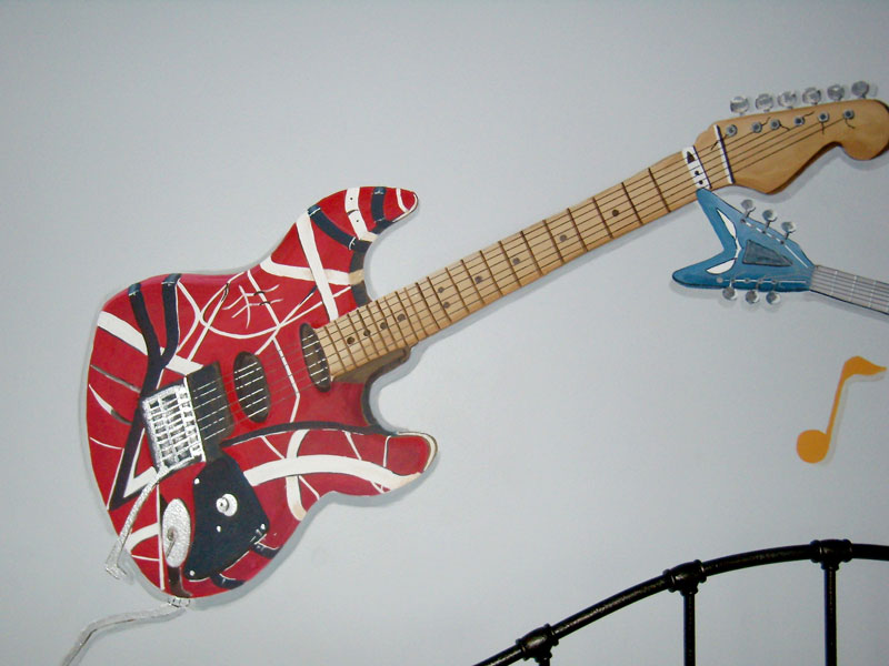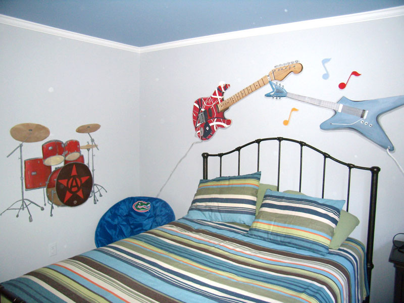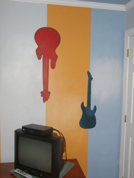This room of guitars and drums was painted for a 5 year old who had "outgrown" the cars and trucks previously on the walls. Crossed guitars are over the bed with drums in the corner. The opposite wall contains broad stripes and silhouetted guitars. In a desk alcove is a microphone with the silhouetted crowd.