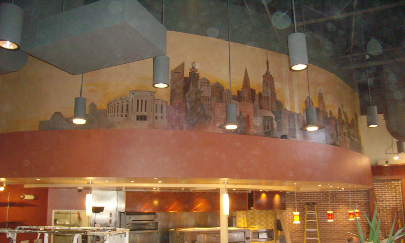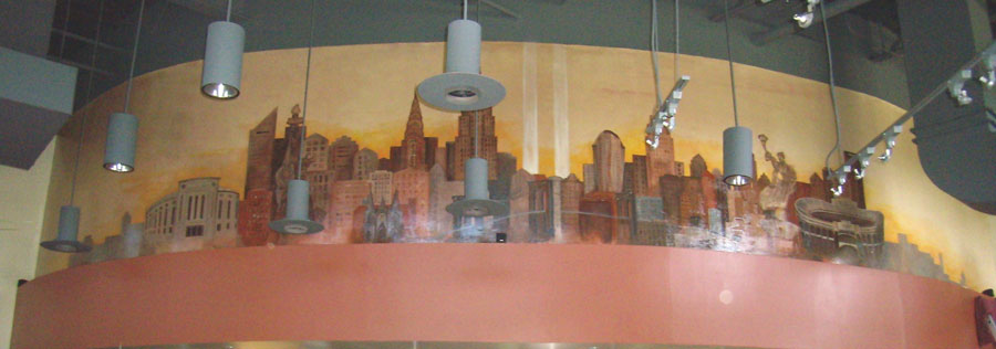 The owner of a new Johnny Brusco's New York Style Pizza in suburban Charlotte, NC wanted to highlight the restaurant with a cityscape combining the distinctive skylines of New York City and Charlotte. The resulting 6' high mural wraps around a 40' panel above the restaurant's open kitchen area, and is painted in three basic colors to compliment the decor and give a "silhouetted" effect with the sun setting behind the buildings.