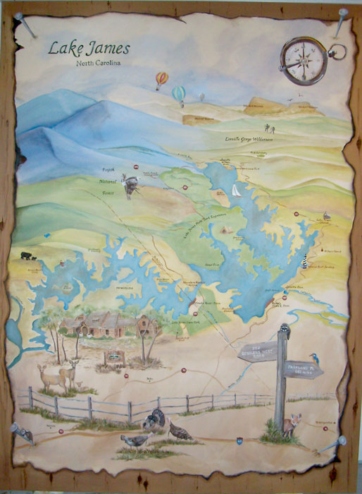 The owner of a log cabin home on a lake wanted and old map of the lake so he commissioned CK Paints to paint this 6' x 8' gallery wrapped canvas depicting the key areas and points of interest, along with roads, coves, and his home. The painting is done to simulate and old map on parchment with burned edges.
