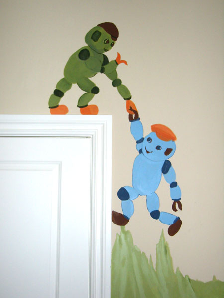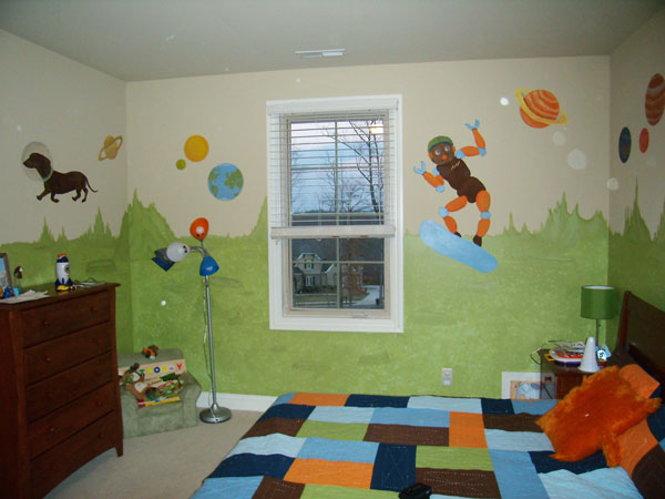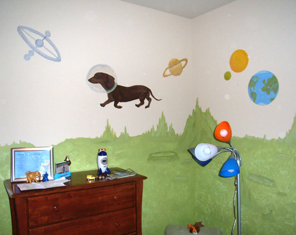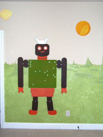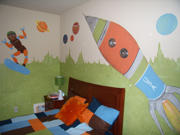 Robots frolic around this moonscape with planets and a large rocket ship above the bed.