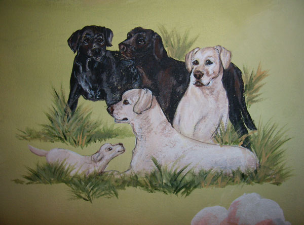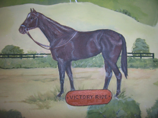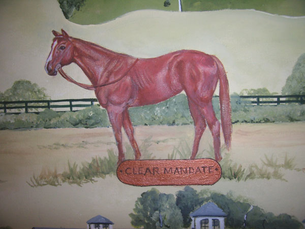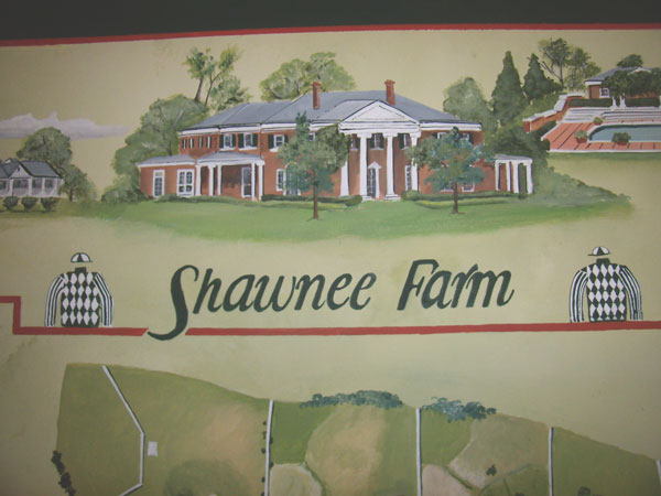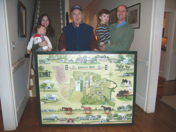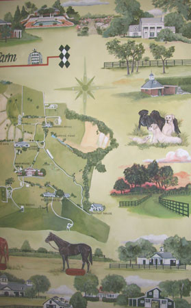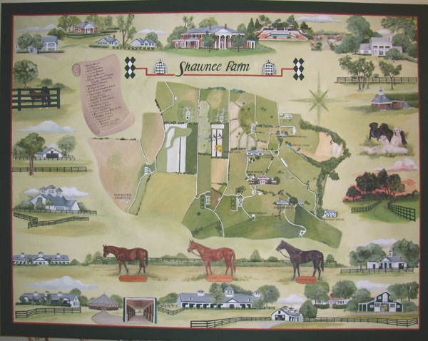 This 60" x 60" gallery wrapped canvas depicts an aerial view of a family home farm in Kentucky. The border contains vignettes of buildings and points of interest on the property.