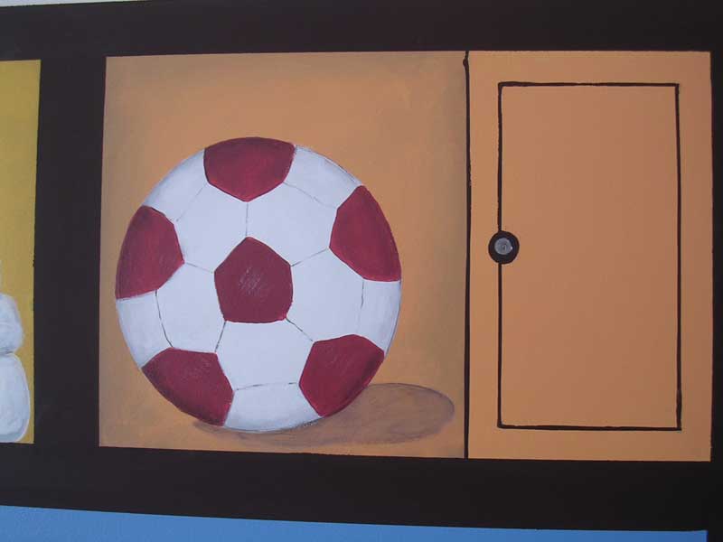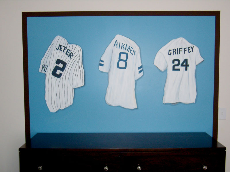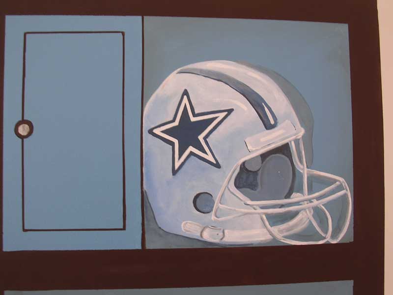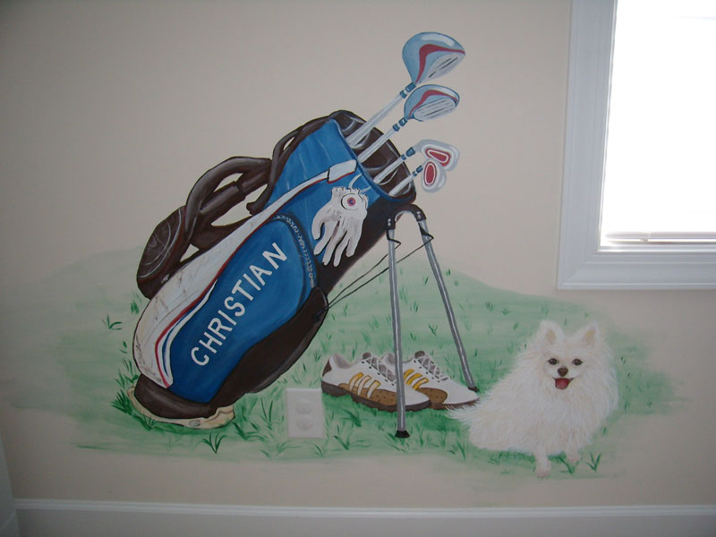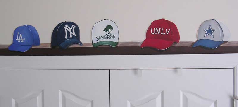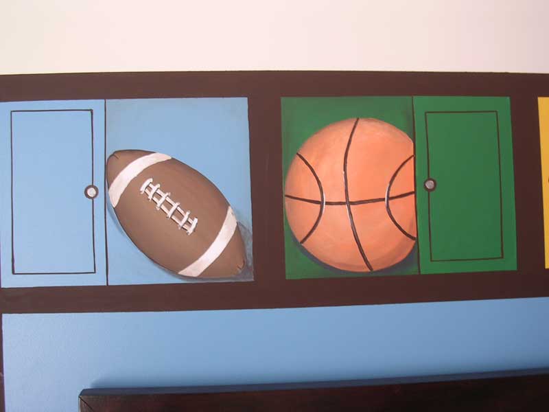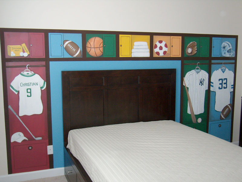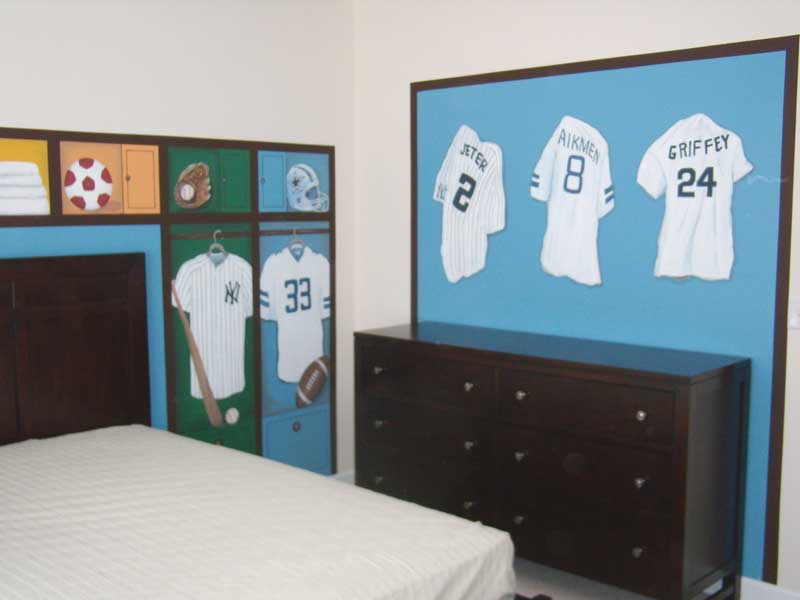 Lockers with golf balls, footballs, basketballs, baseballs and jerseys of his heroes surround Christian's bed. Above his dresser hang "faux" jerseys of more sports figures. Hats are placed on a shelf across the top of the closet and his golf bag sits by the window.