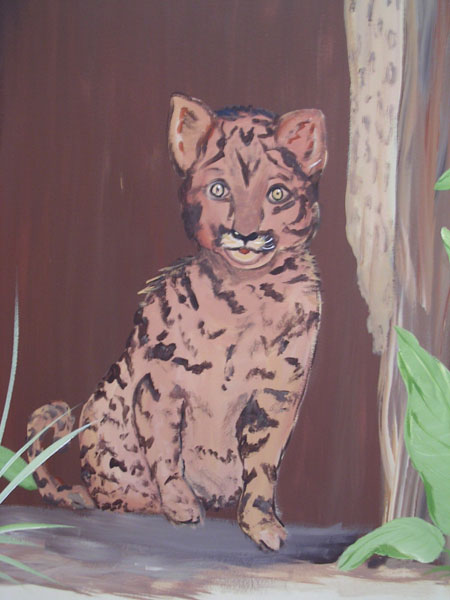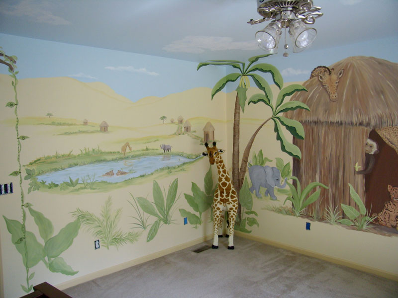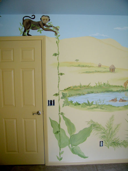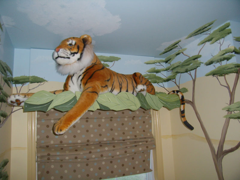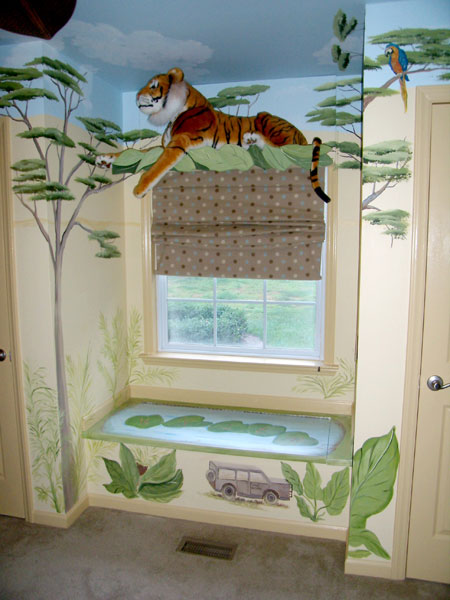 This nursery will fit boy or girl. Who doesn't like the friendly jungle? The room includes a growth chart held by a monkey and the window alcove is watched over by the stuffed tiger who sits in the trees. (a shelf built, cut, and painted to look like leaves)