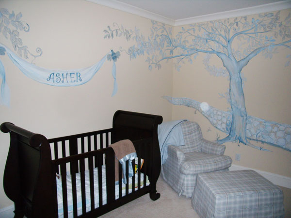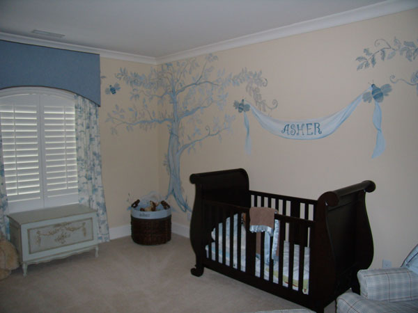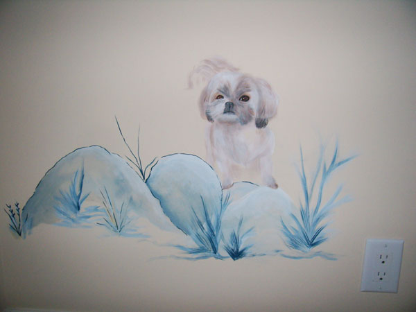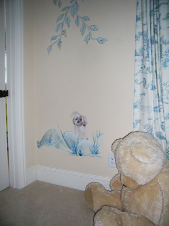 A nature scene inspired by the pale blues and indigos of traditional toile. Whimsical trees and a stone wall create the landscape while a playful pup watches from behind a group of stones.