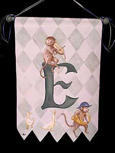 A musical parade! This wall hanging features the harlequinn diamond backgroundof sage green and white. Our monkey's are very talented and can play many instruments (you may want to specify specifc ones). Specify the letter you want. The colors shown can be adjusted to match your room decor. Just specify on special order form.. Hand painted (no stencils) on canvas and coated with a clear, non-toxic sealer for protection and easy cleaning. It comes with a dowel rod and decorative finials and ribbons ready to hand on a door or wall.
