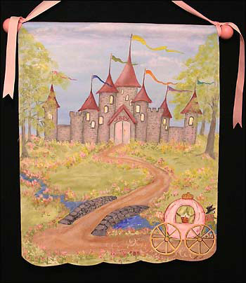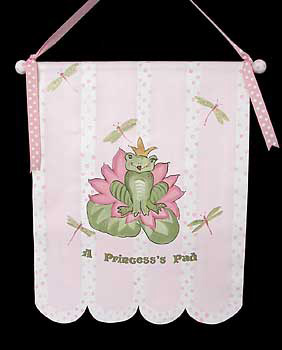 A very popular design for your little princess. The Princess frog has long eyelashes and wears a gold crown. Pink and green are the predominant the colors. Dragonflies soar around the pink and white striped background. This can be further personilized with a name for no extra charge. This unique design is hand painted on canvas and coated with a clear, non-toxic sealer for protection and easy cleaning. It includes a dowel rod with decorative finials and ribbons ready to hang on a door or wall.