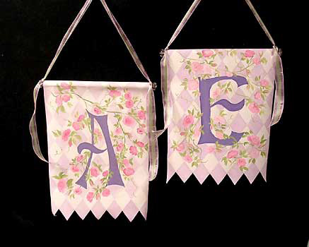 The letter is surrounded with beautiful shades of pink flowers and green vines - a beautiful addition to any little girls room. The background is colorful harlequin diamonds. This unique design is hand painted on canvas and coated with a clear, non-toxic sealer for protection and easy cleaning. It includes a dowel rod with decorative finials and ribbons ready to hang on a door or wall.