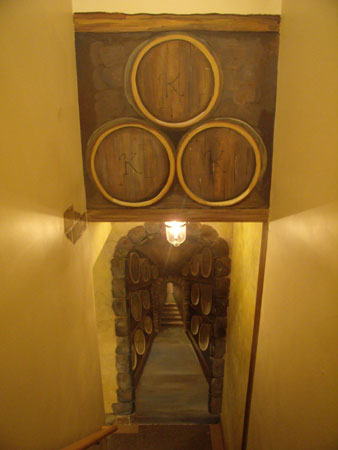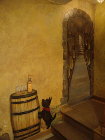 Handpainted barrels and a faux doorway provide the visual illusion of a well stocked Whiskey cellar.
