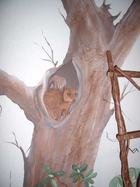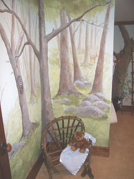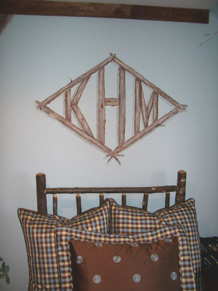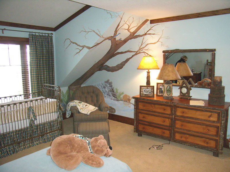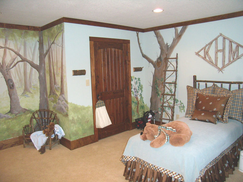 The object here was to bring the wooded outside into the room. Few leaves were included to give the room a rustic look and compliment the furniture. A faux log monogram appears above the bed.